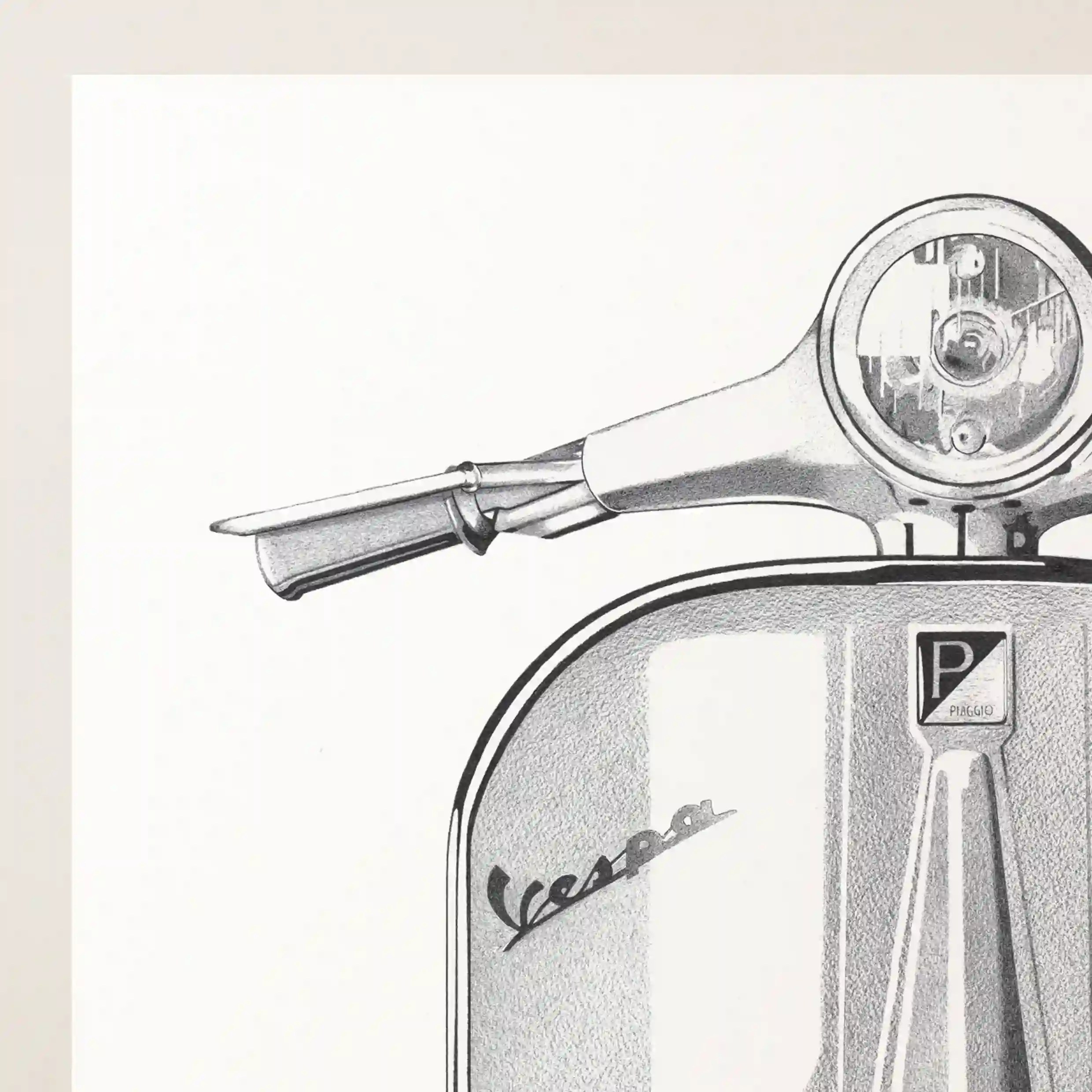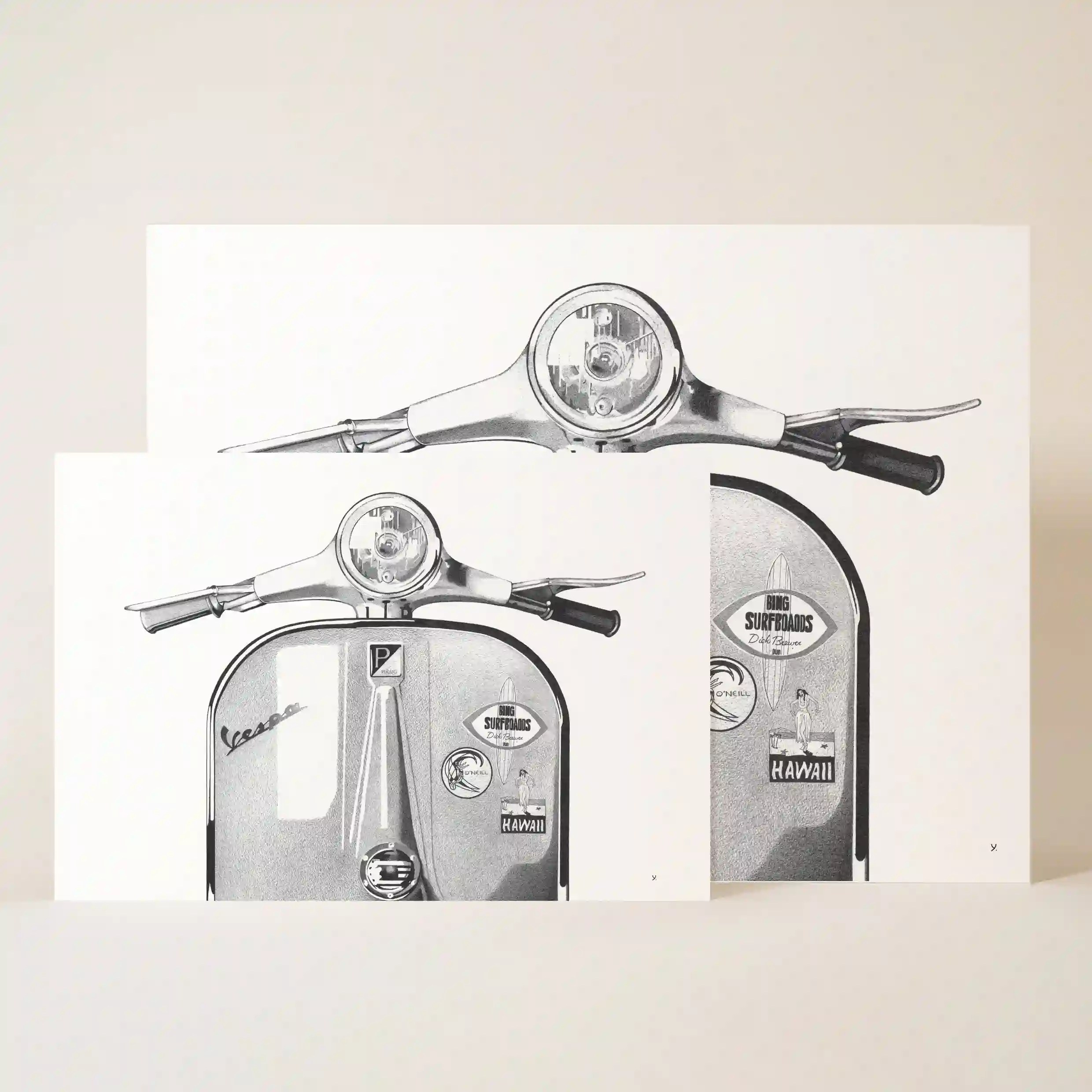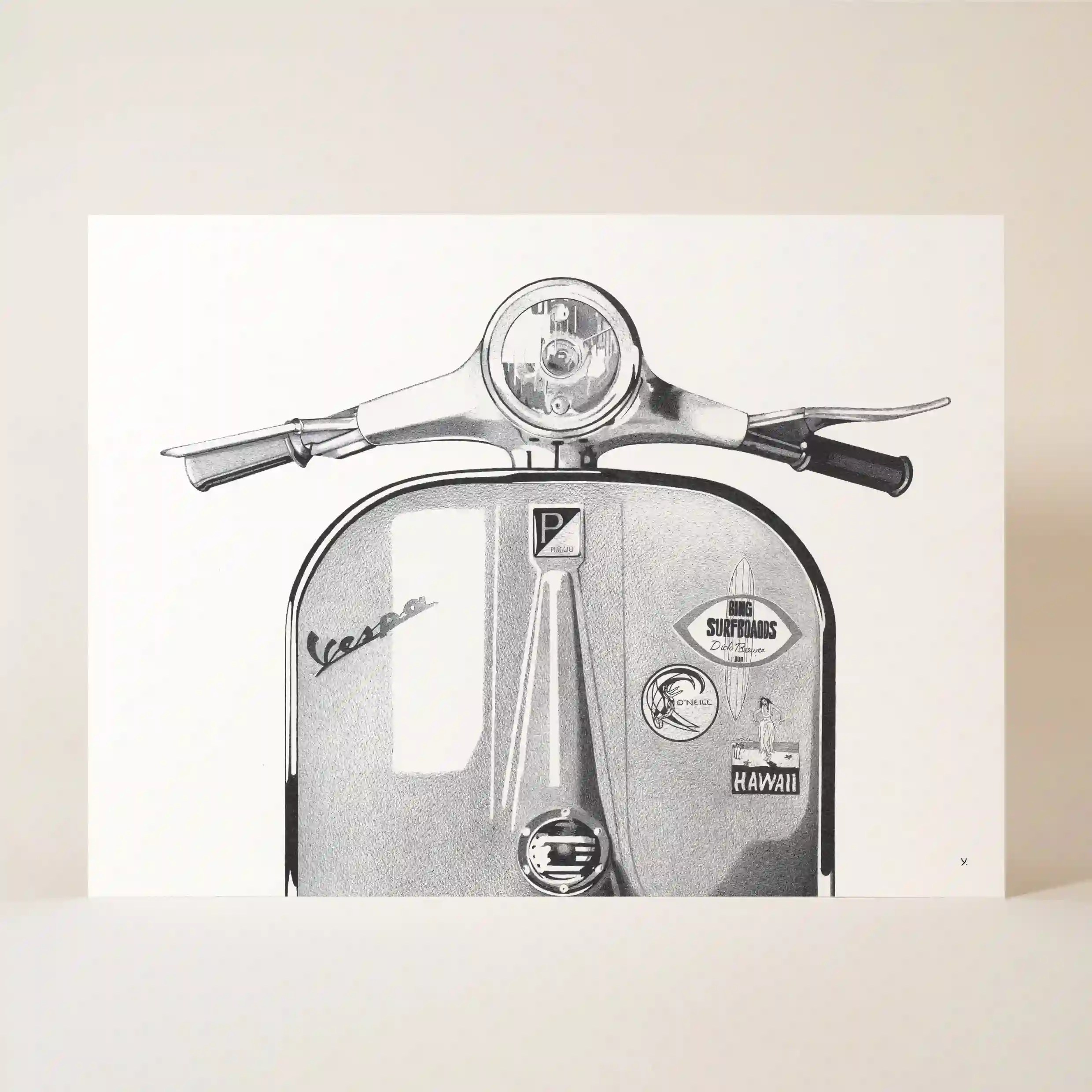 L’illustration présente un scooter Vespa vu de face, ses poignées tendues comme une invitation au départ. Chaque détail est travaillé avec une minutie remarquable : le phare central, les poignées classiques, les reflets métalliques sur la carrosserie et surtout, les stickers vintage qui ornent le capot avant. Ces autocollants racontent une histoire : une vie de voyage, d’escapades sur des routes longeant l’océan et de journées ensoleillées à surfer sur les meilleures vagues du monde.