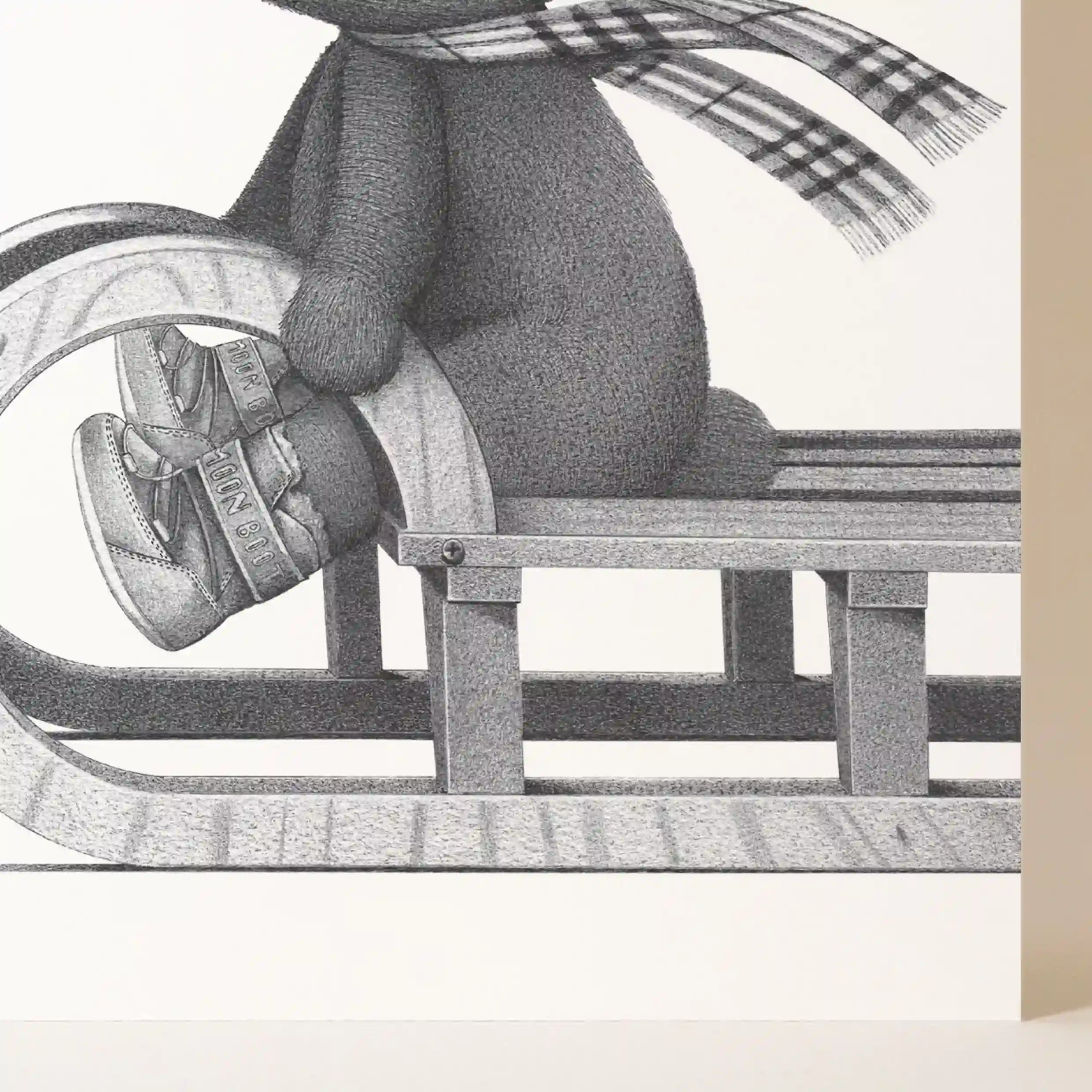 Plongez dans un univers tendre et enchanteur avec cette affiche montagne mettant en scène un adorable ourson confortablement installé sur une luge en bois. Ce dessin monochrome d’une grande finesse joue avec les textures et les contrastes pour donner vie à une scène hivernale à la fois douce et nostalgique. Une véritable invitation à la rêverie et aux souvenirs d’enfance.