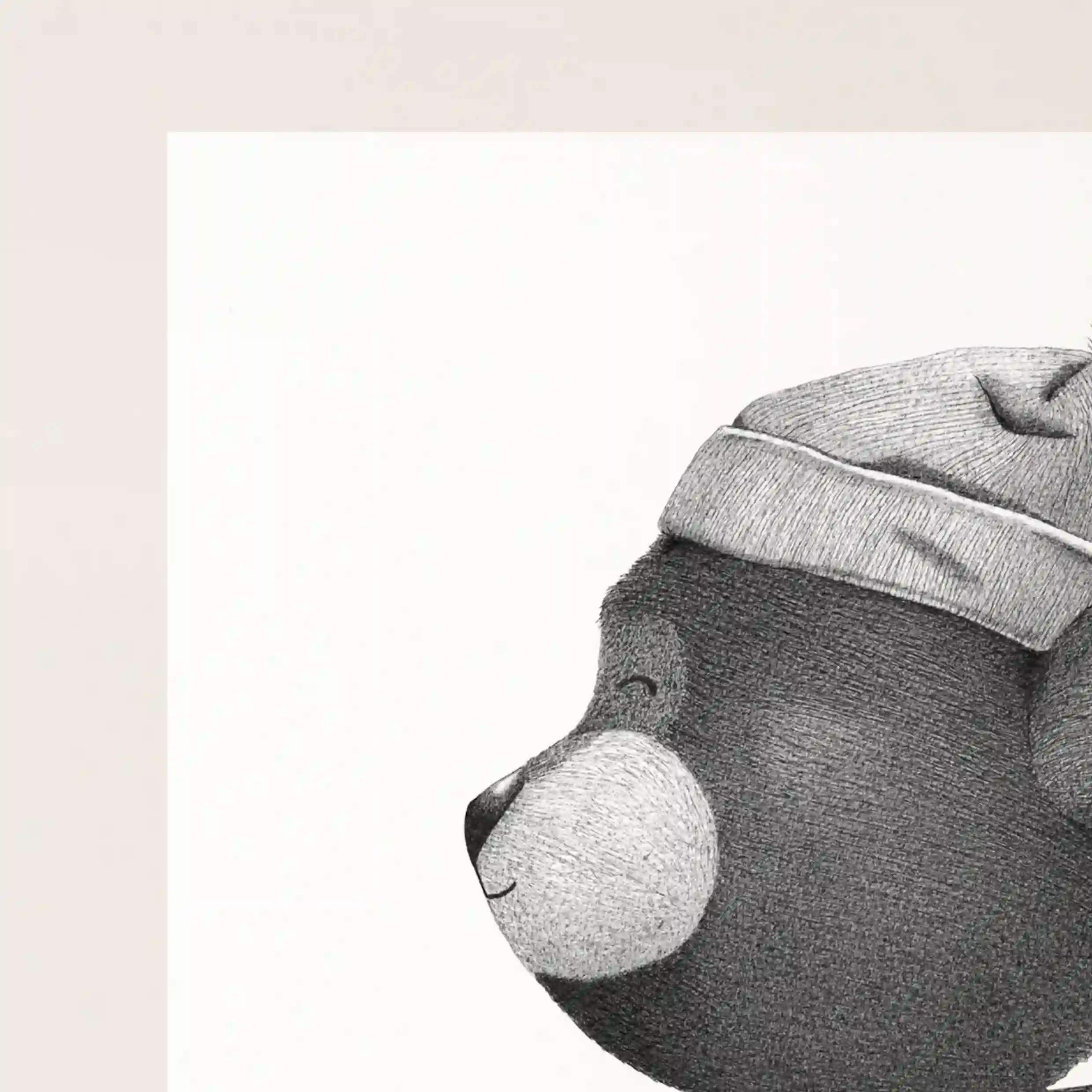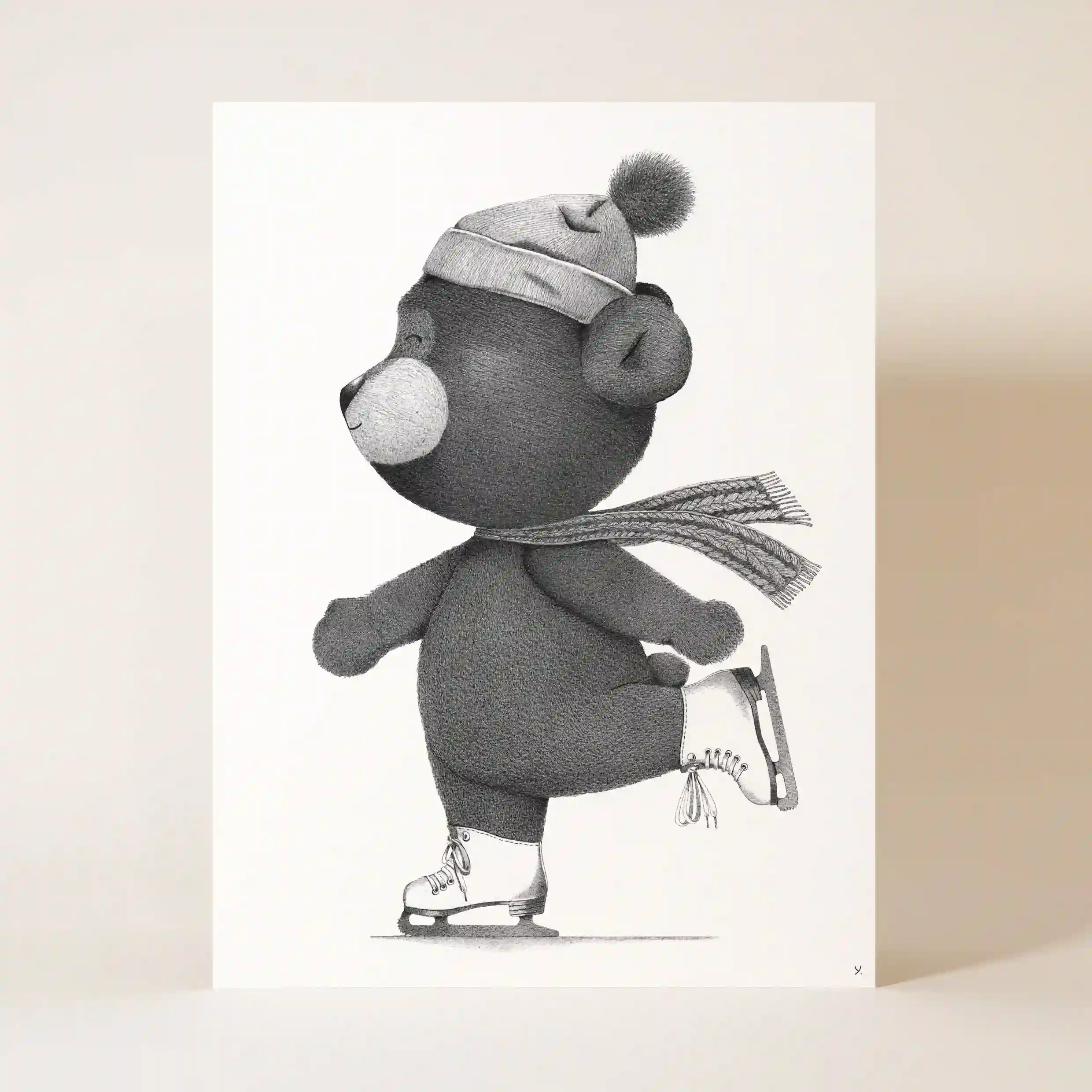 Plongez dans un univers doux et enchanteur avec cette affiche montagne représentant un adorable ours en pleine session de patinage. Ce dessin en noir et blanc allie réalisme et tendresse pour offrir une illustration unique qui séduira petits et grands.