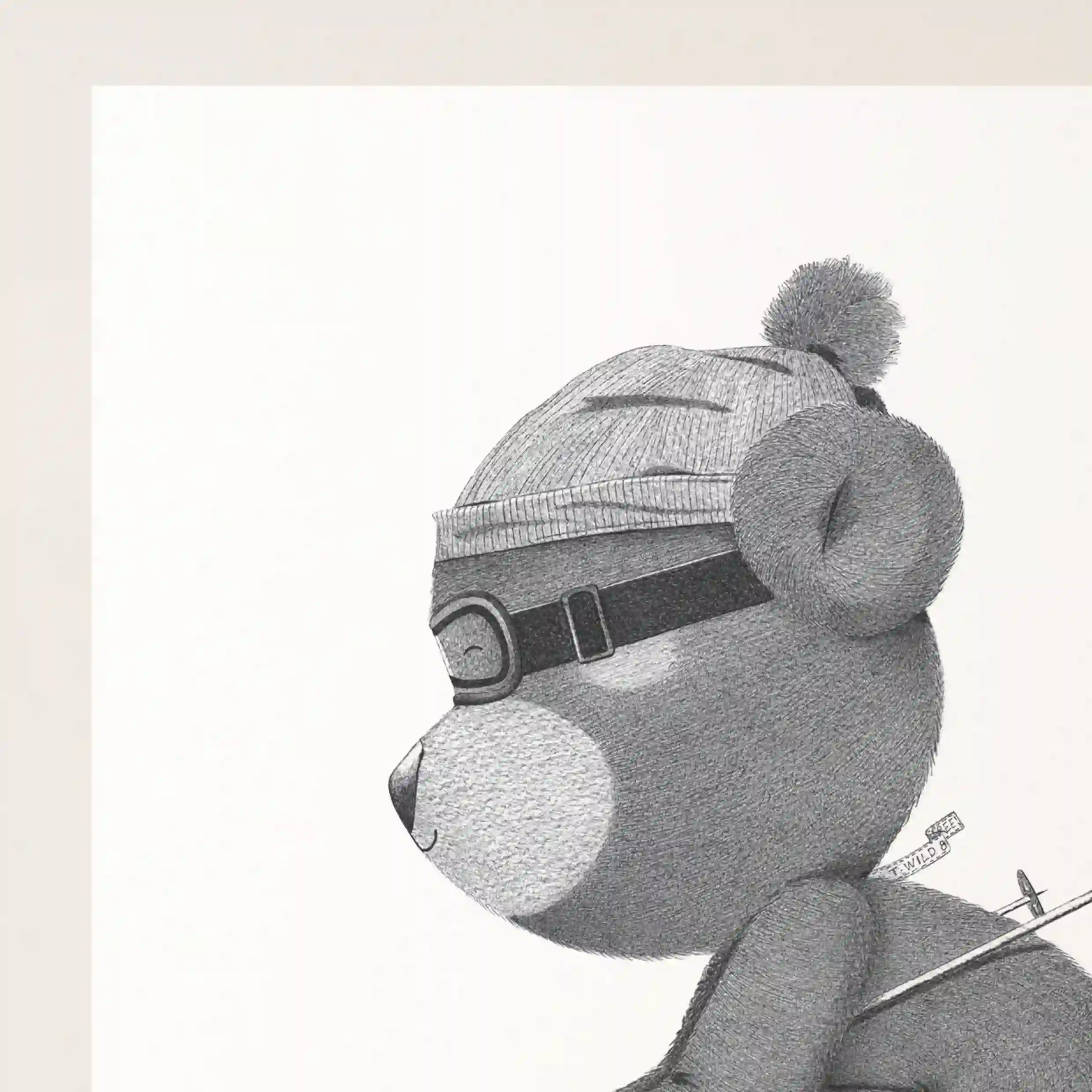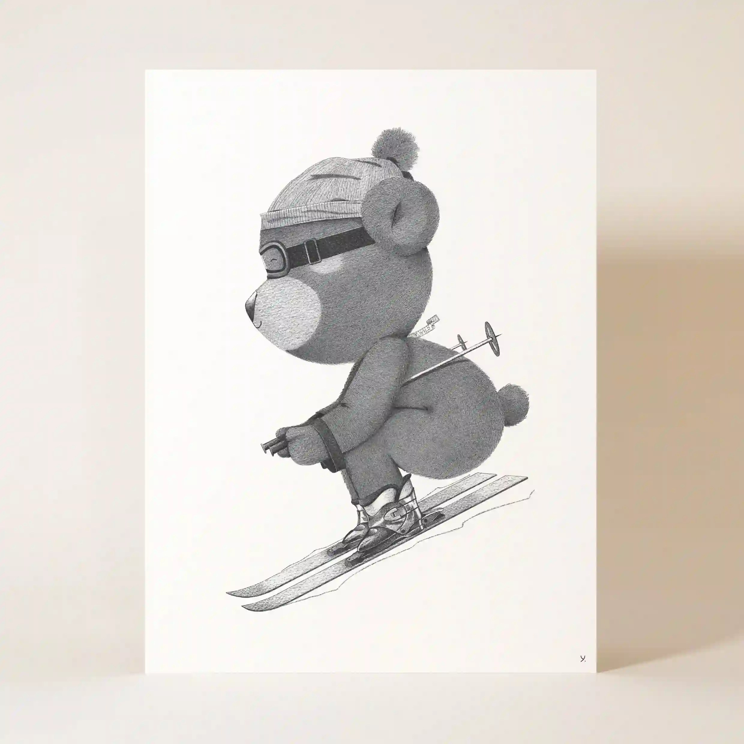Le réalisme du dessin est saisissant : chaque détail, du pelage doux de l’ourson aux reflets sur ses chaussures de ski, est minutieusement travaillé pour offrir une composition à la fois amusante et raffinée. Cette affiche originale capture l’essence du ski, mêlant la sensation de vitesse, la maîtrise et le plaisir de la glisse.