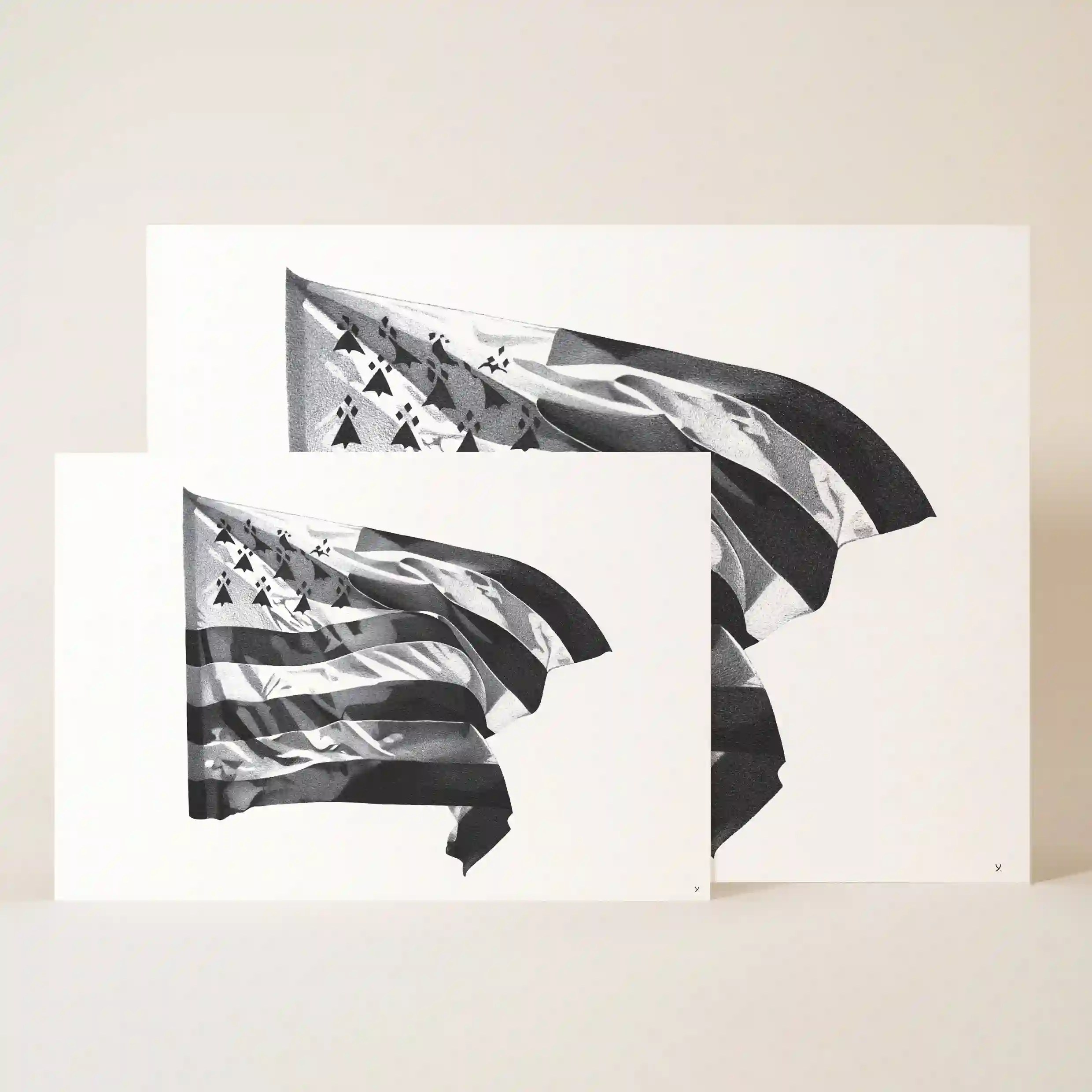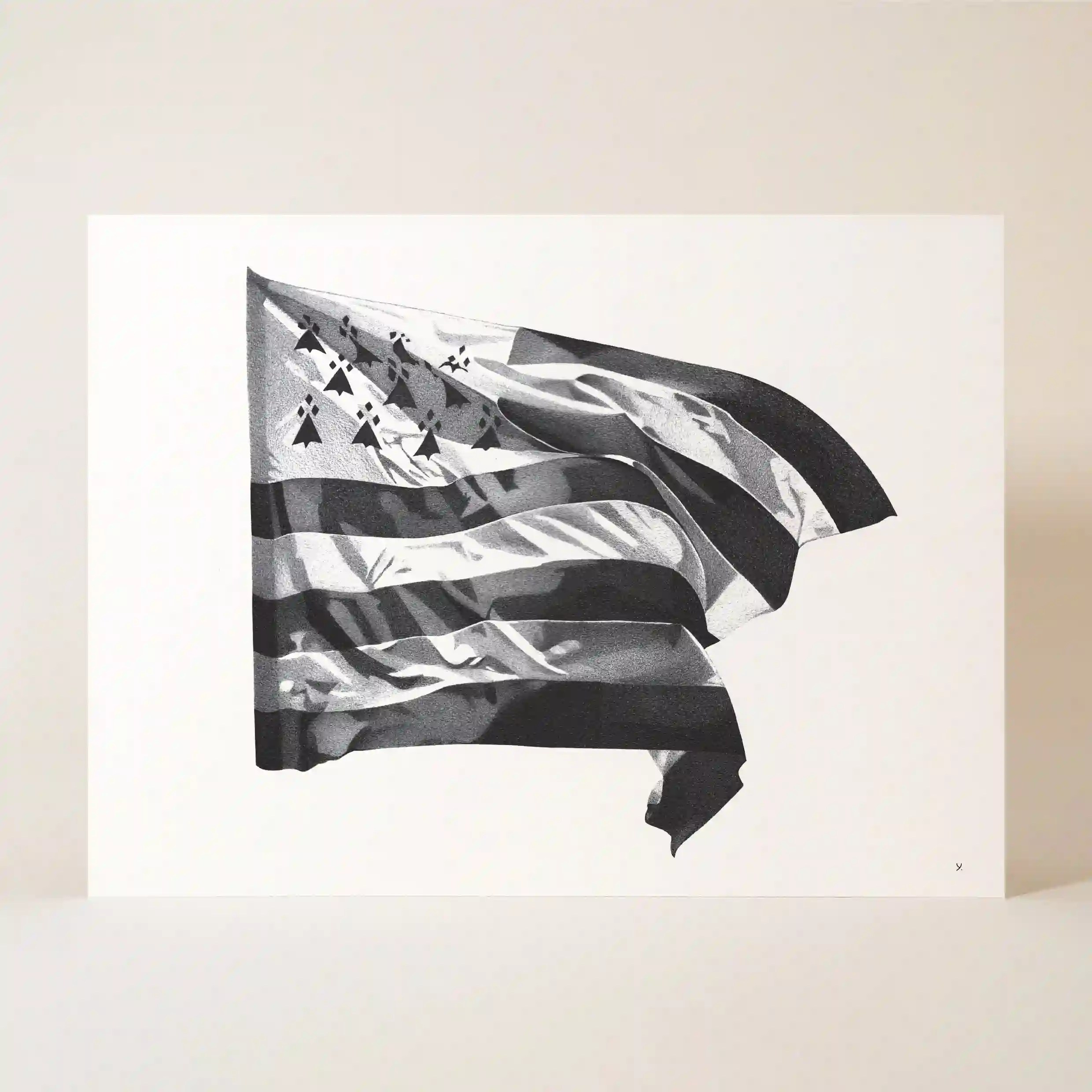 Affichez votre amour pour la Bretagne avec cette affiche mer originale, représentant fièrement le drapeau breton, le Gwenn-ha-Du, flottant au vent. Ce dessin en noir et blanc capture à la perfection la texture du tissu ondulant, reflétant à la fois la puissance et l’élégance de cet emblème régional. Plus qu’un simple drapeau, cette illustration évoque un profond attachement à la mer, à l’identité bretonne et à ses traditions.