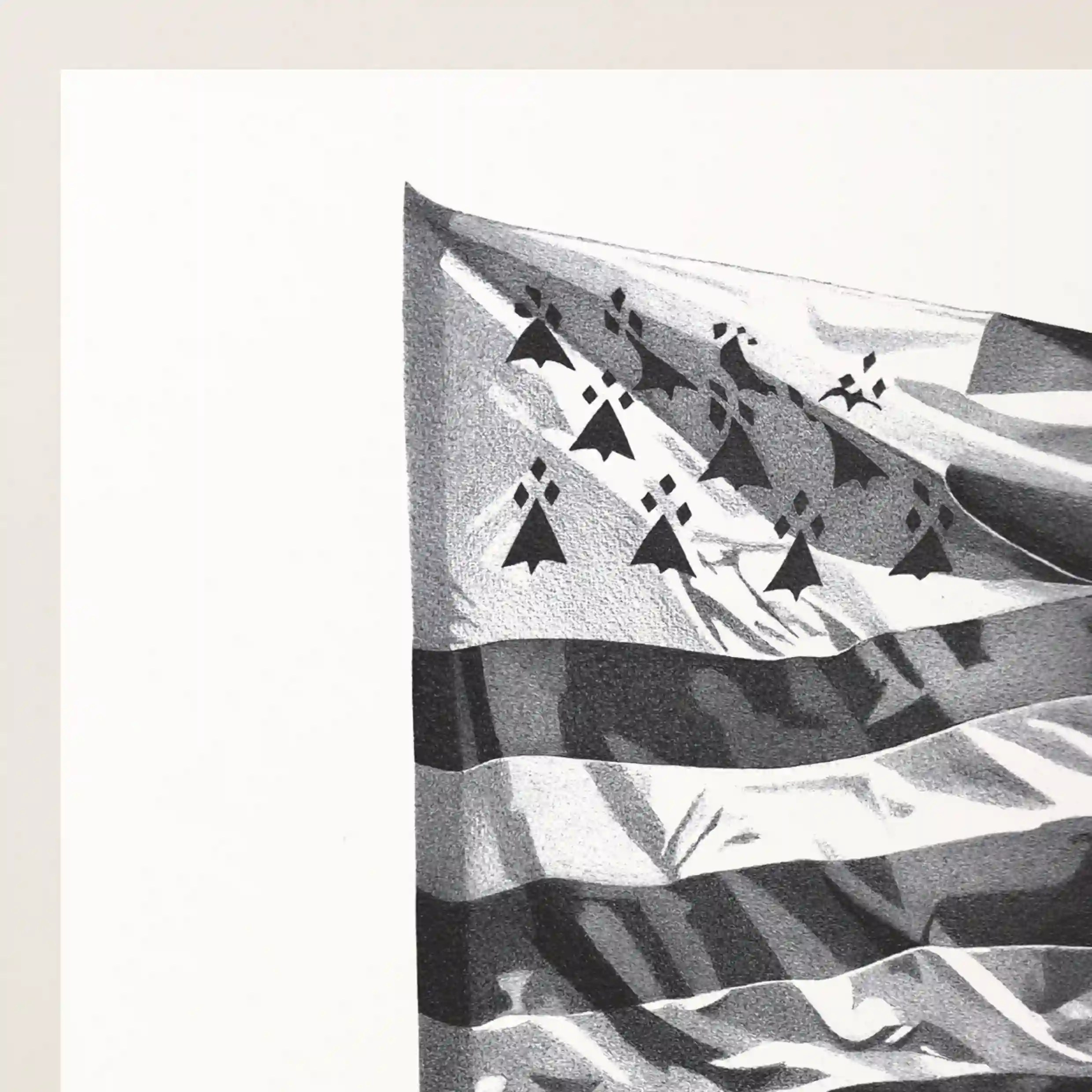 Dans ce dessin, le drapeau semble prendre vie, flottant avec légèreté sous l’effet du vent marin. L’artiste a su retranscrire la dynamique du mouvement du tissu avec une incroyable précision, jouant avec les ombres et les contrastes pour accentuer l’effet de profondeur et de réalisme.