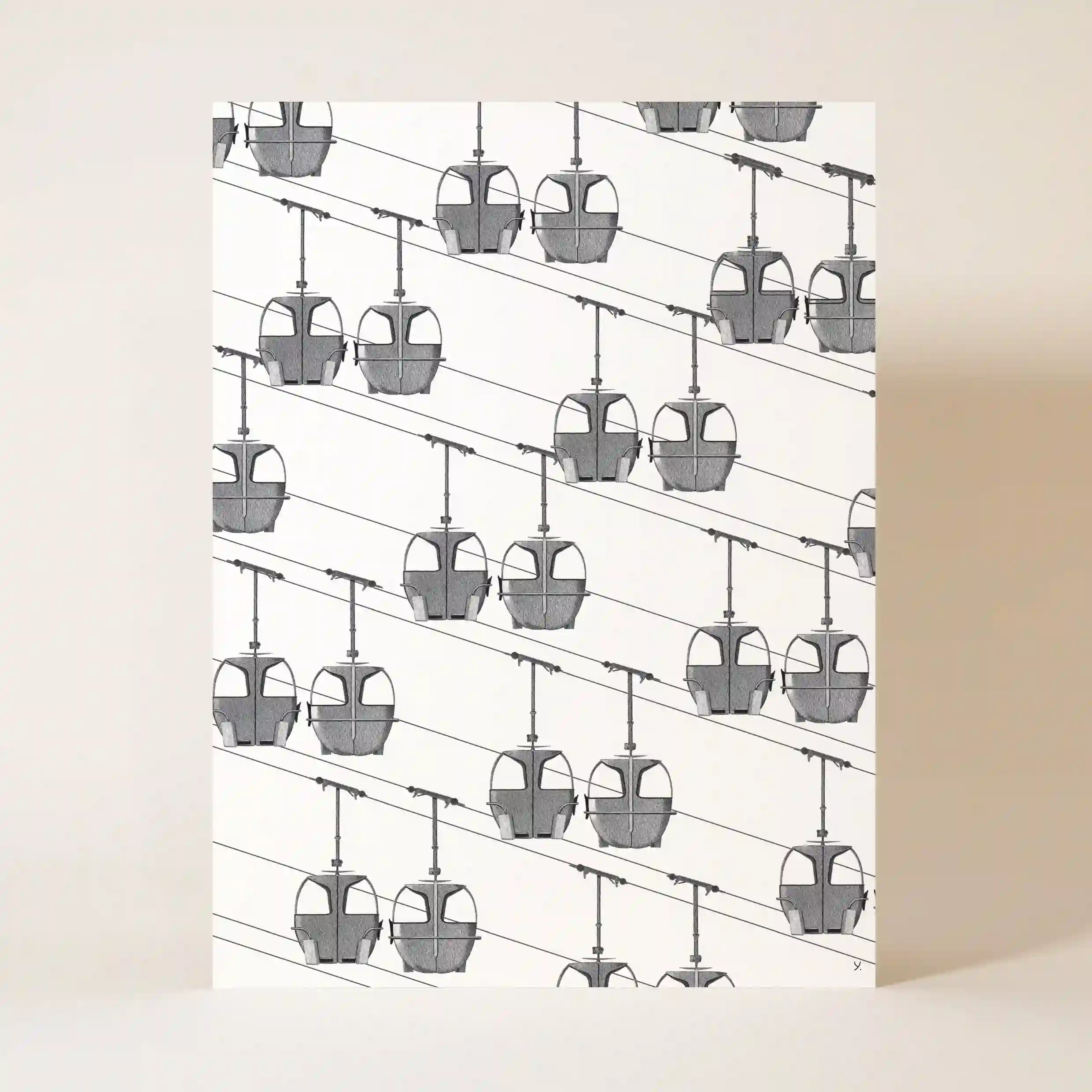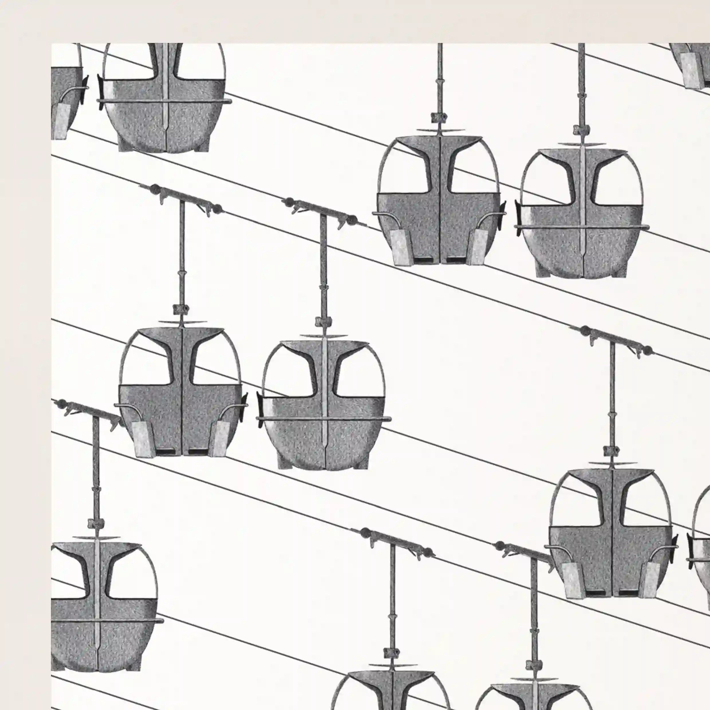 Dans cette affiche montagne, les télécabines, éléments emblématiques des stations de ski, se répètent en diagonale, donnant une impression de mouvement infini. Les câbles s’entrecroisent avec précision, créant une perspective dynamique qui plonge le spectateur dans une descente virtuelle vers les sommets enneigés.