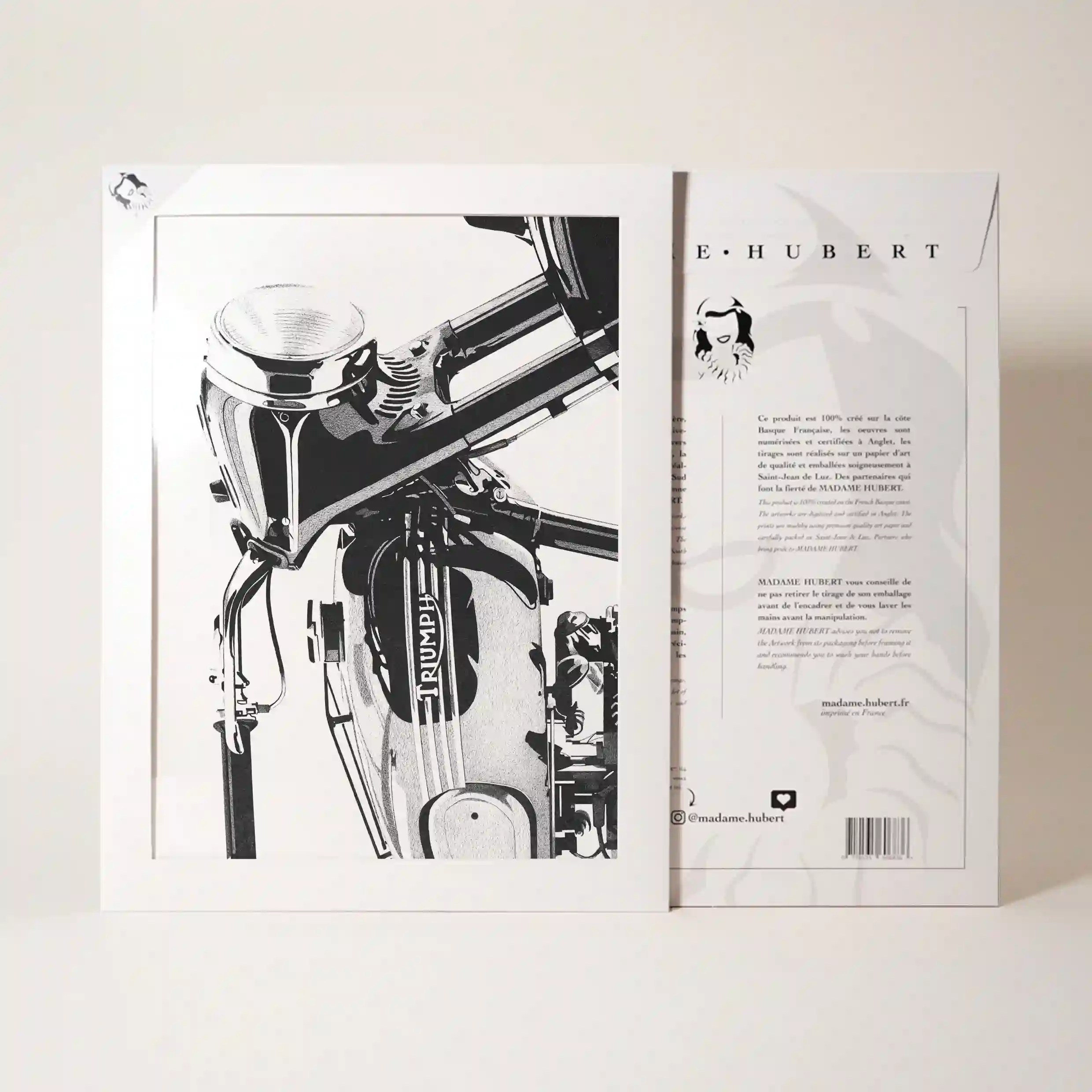 Imprimée sur un papier de haute qualité, cette affiche originale est réalisée avec une attention particulière aux détails. Le grain du papier et la finesse de l’impression garantissent un rendu net et fidèle au dessin original. Que ce soit pour offrir à un passionné de moto ou pour enrichir votre propre décoration murale, cette affiche est une pièce forte qui ne laissera personne indifférent.