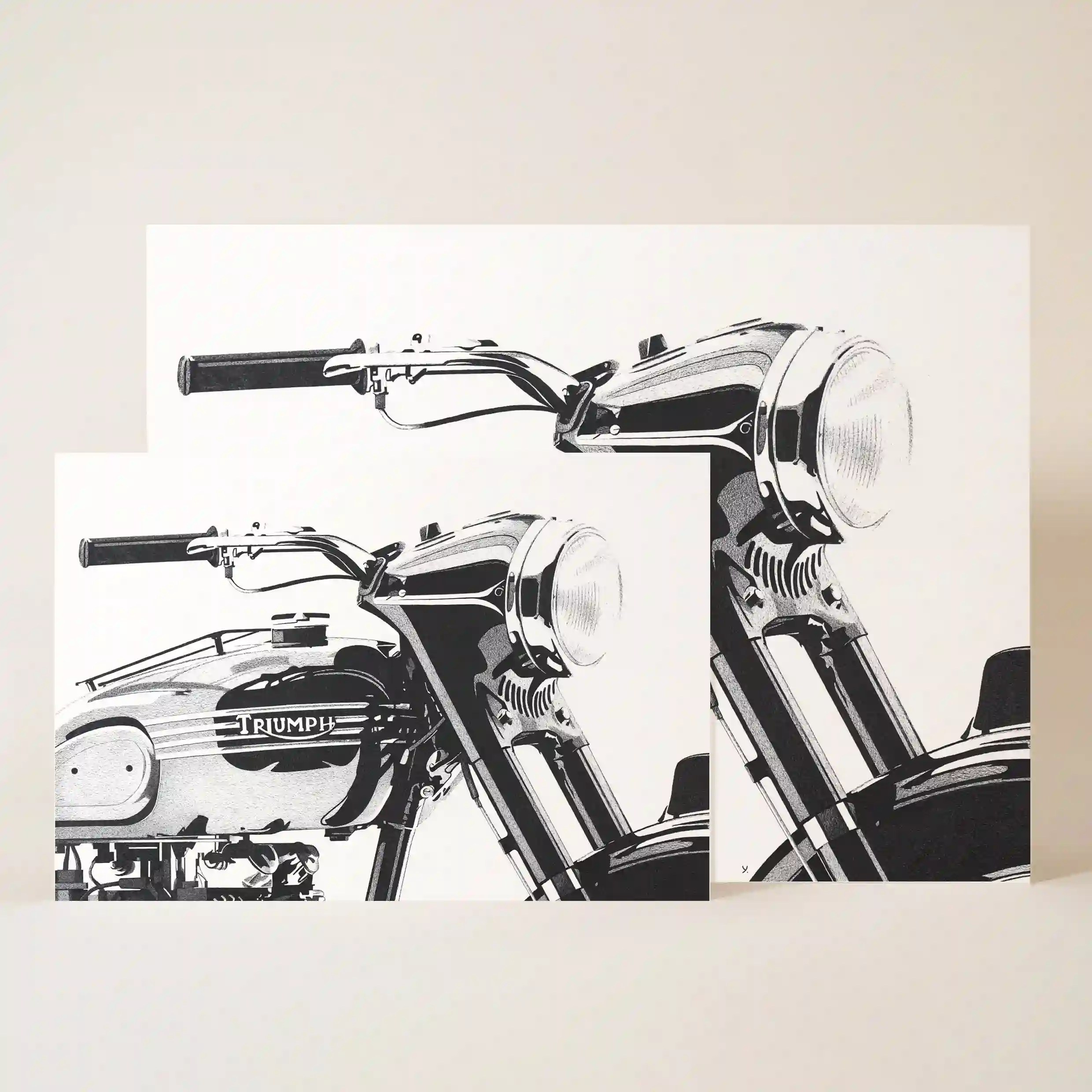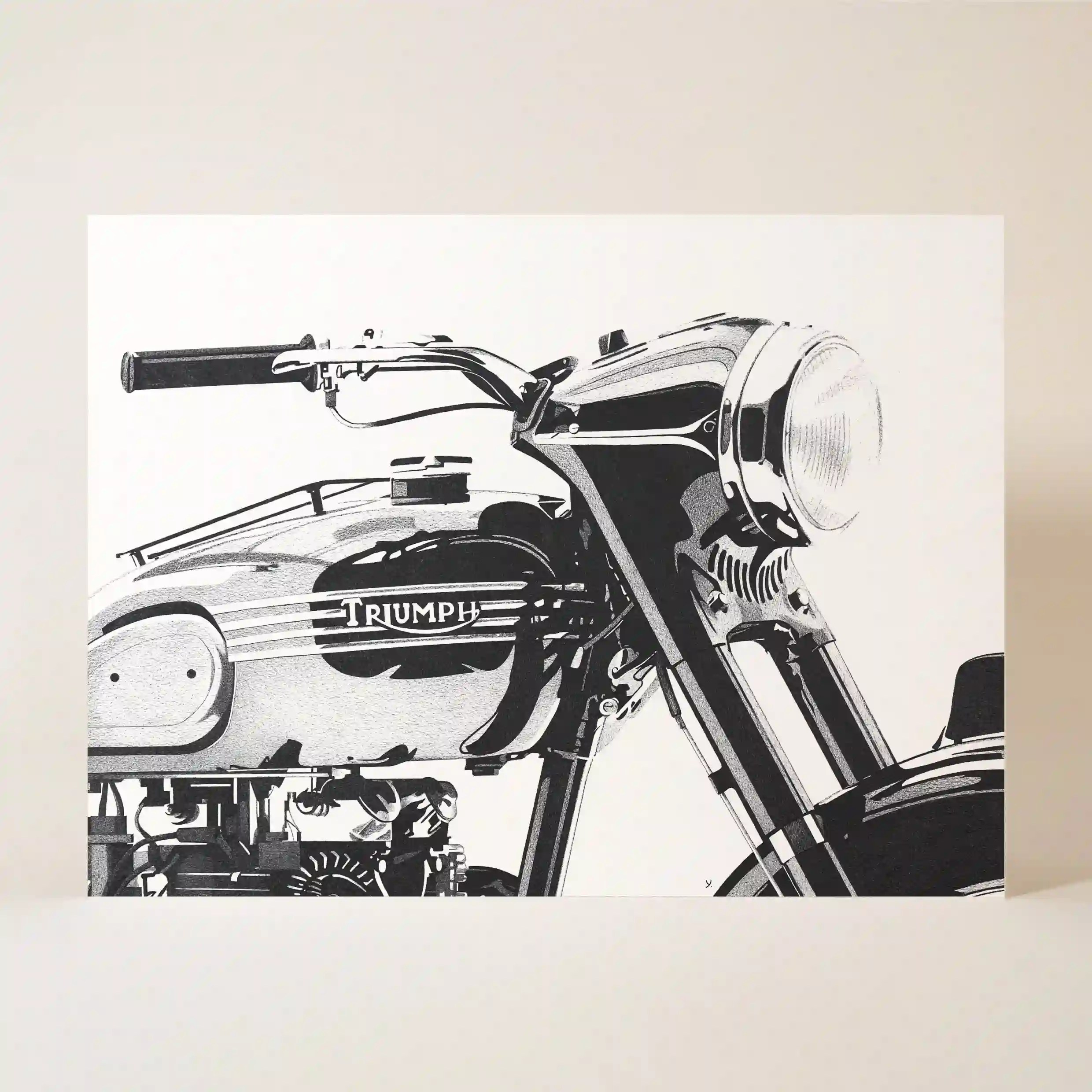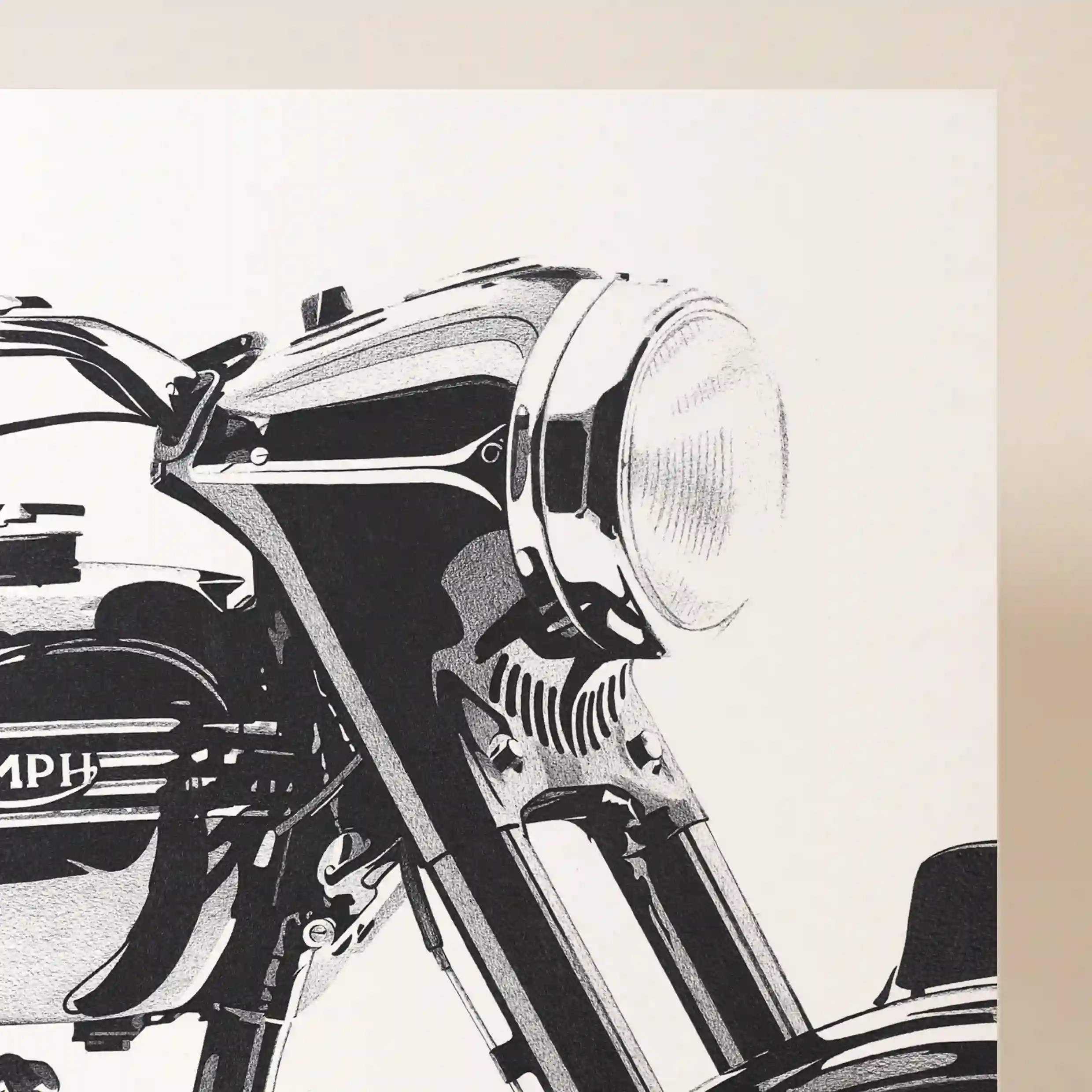 Cette affiche originale se distingue par son réalisme et son approche artistique. La composition met en avant la partie avant de la moto, avec son réservoir emblématique marqué du logo Triumph, son phare rond aux reflets métalliques et son guidon rétro qui rappelle les grandes heures du motocyclisme classique. L’angle du dessin, en gros plan, offre une perspective immersive, donnant presque l’impression que l’on pourrait enfourcher la moto pour une virée sur la côte.