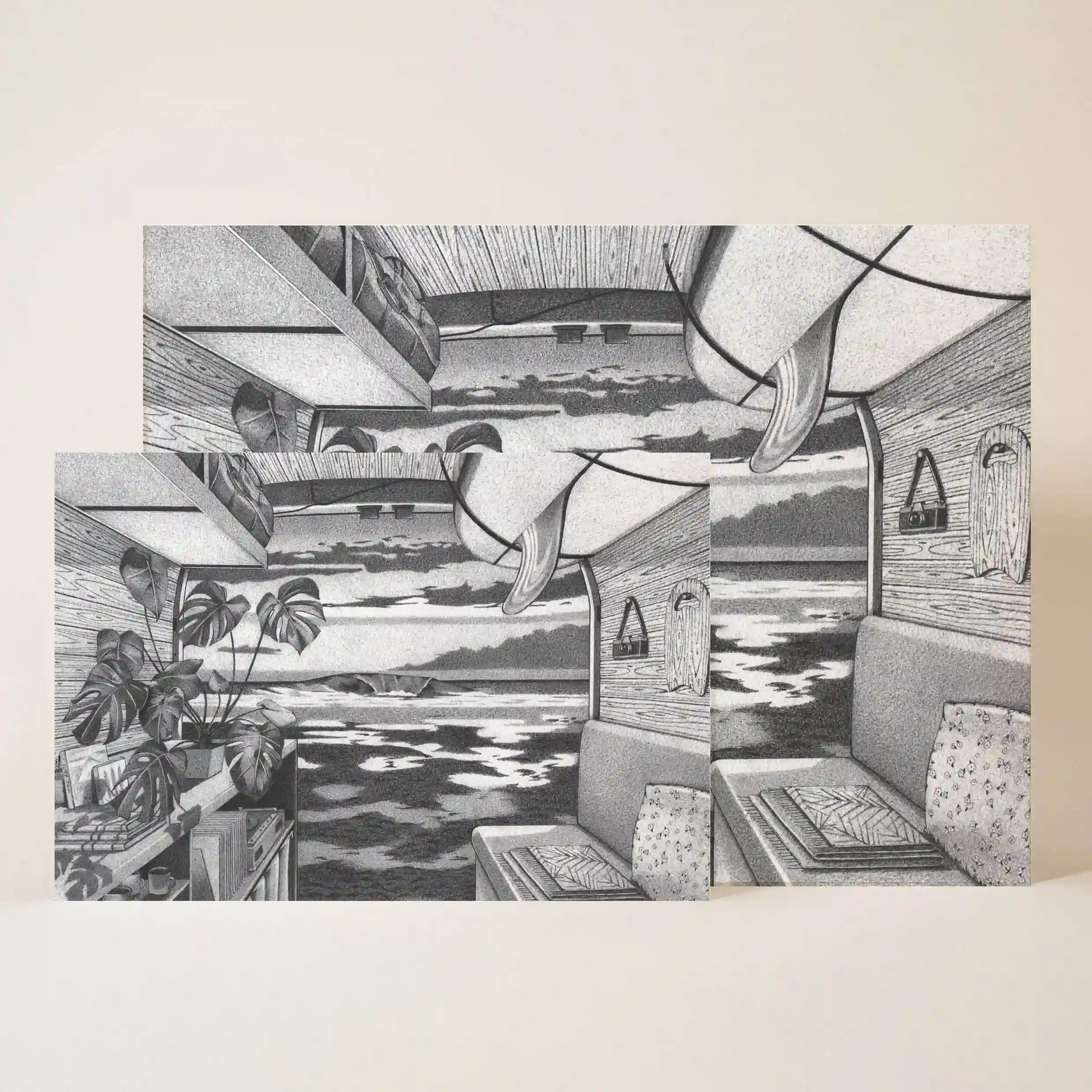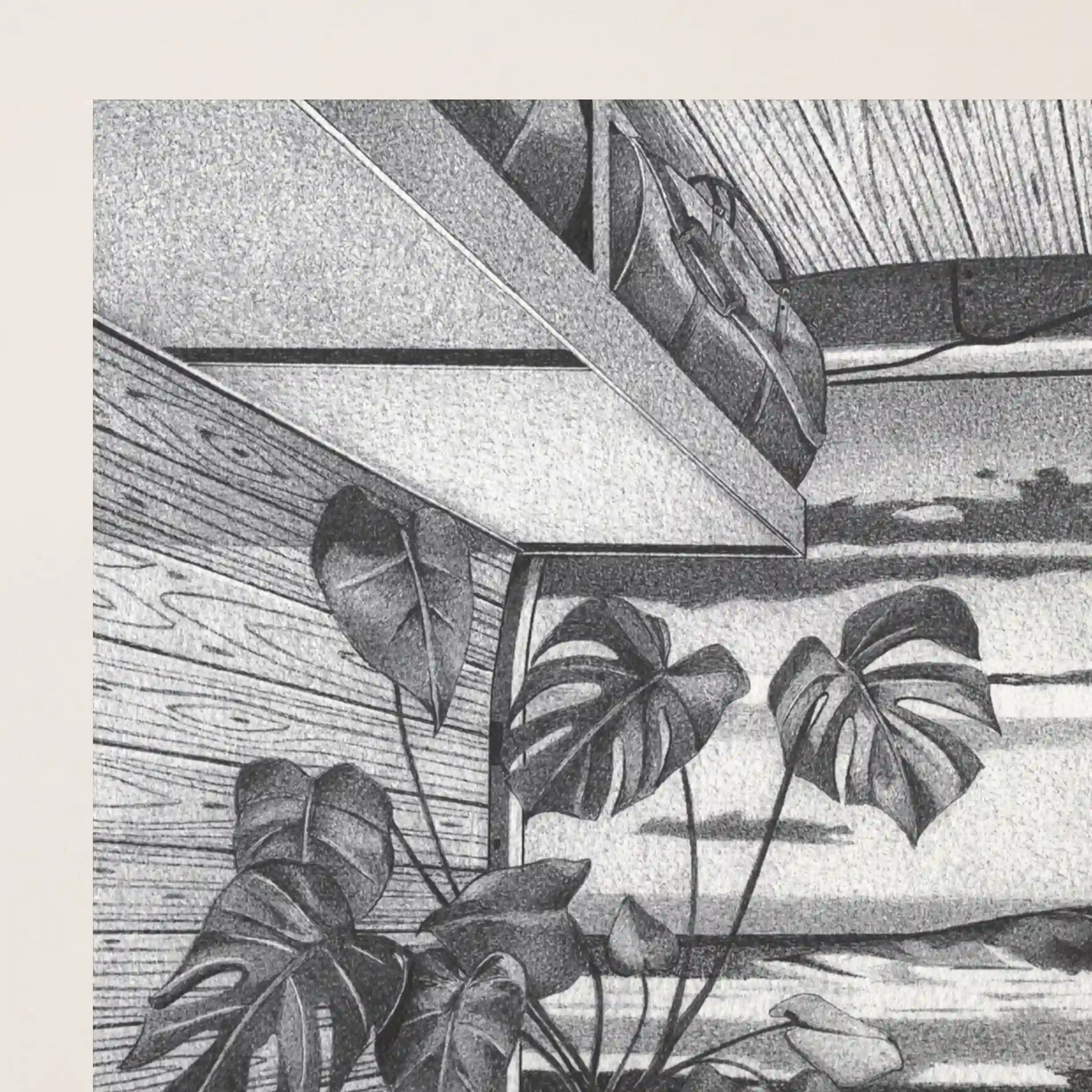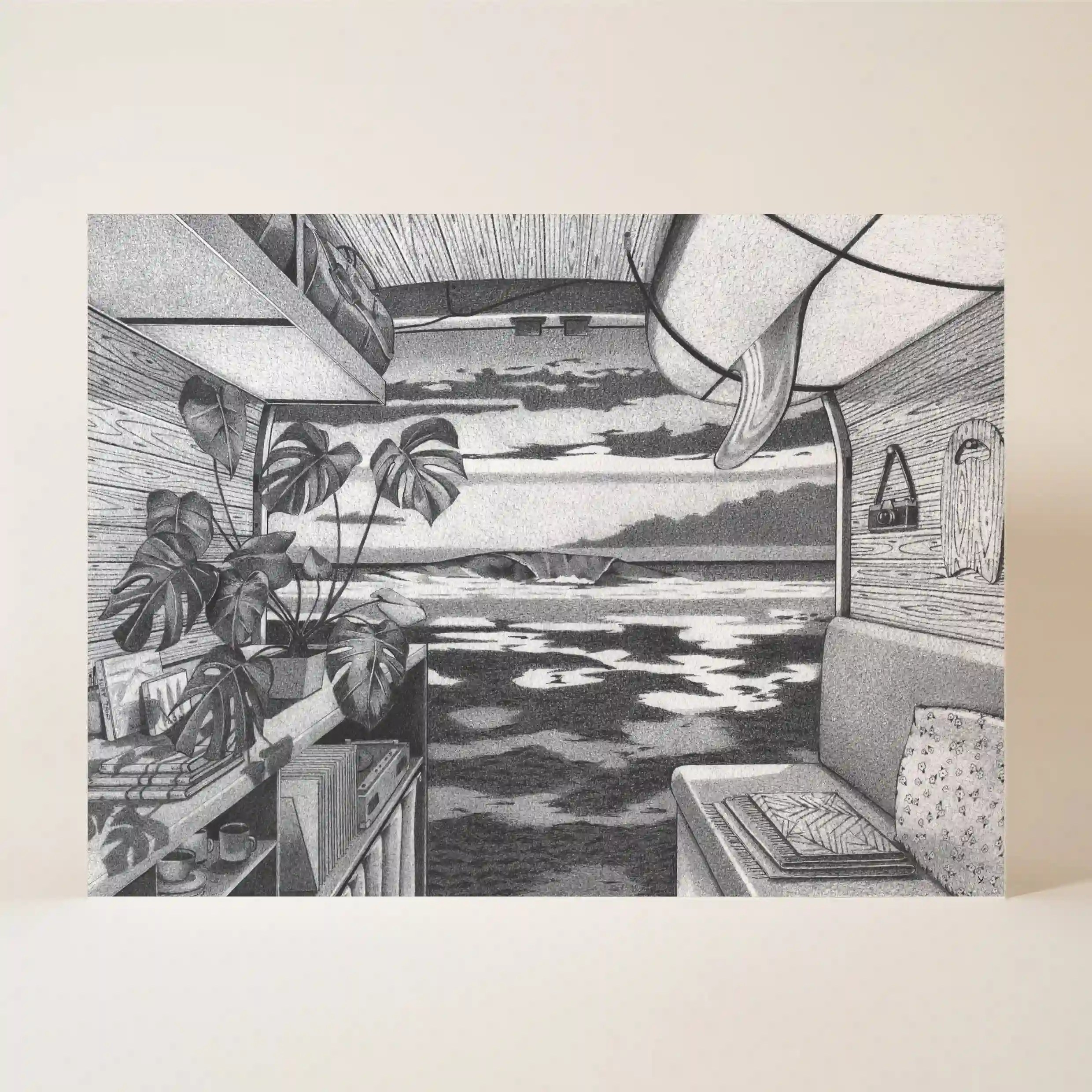 Cette affiche originale est un véritable chef-d’œuvre de finesse et de réalisme. À travers un dessin en noir et blanc, chaque élément du décor est minutieusement représenté : le bois chaleureux qui habille les parois du van, les plantes qui insufflent une touche de nature, les livres soigneusement rangés et le surf suspendu au plafond, prêt à être utilisé. Tous ces détails forment une scène de vie où règnent la simplicité et la beauté d’un quotidien au plus près de la nature.