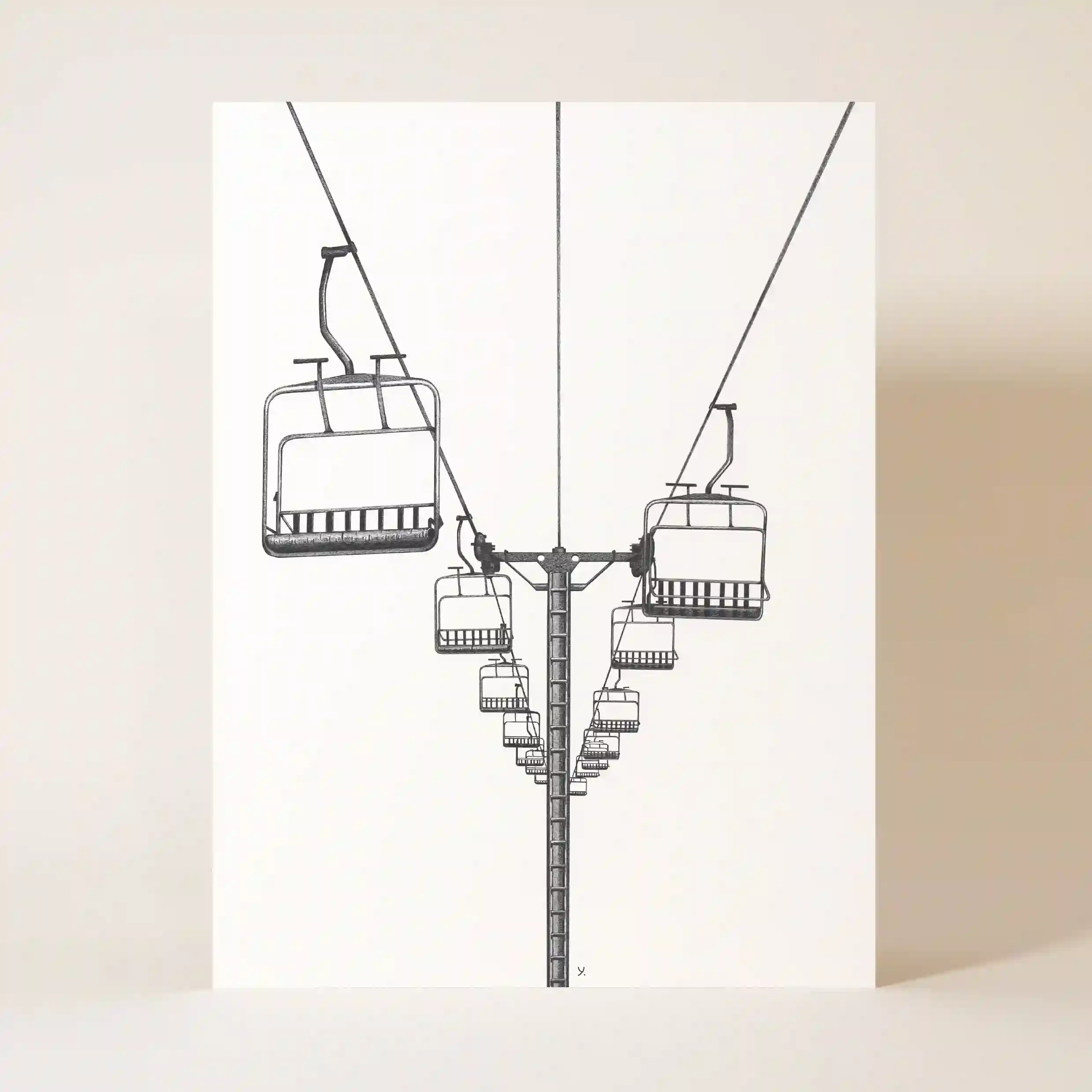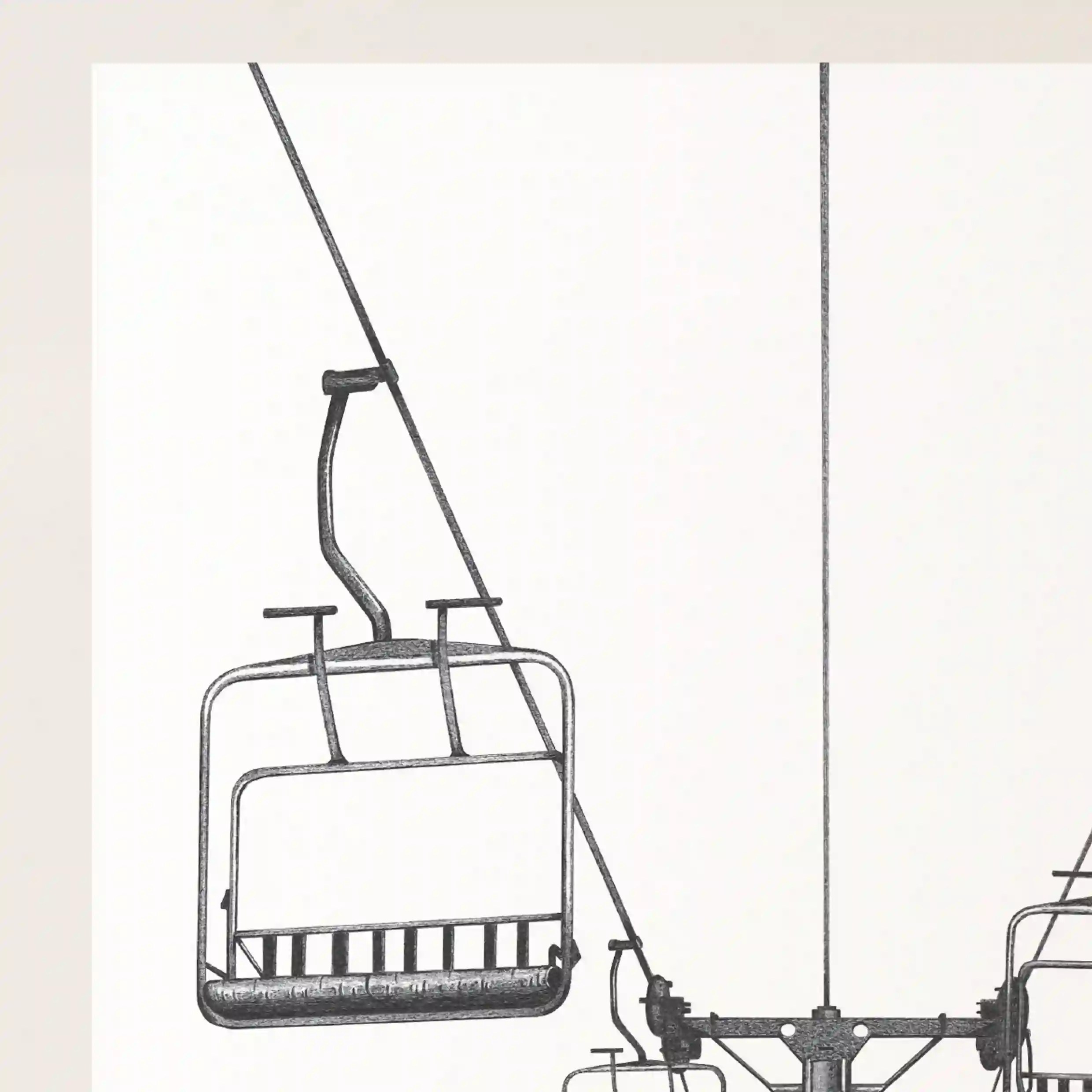 Chaque détail de cette illustration est travaillé avec finesse, depuis les arceaux métalliques des télésièges jusqu’à la structure de la ligne de remontée, rendant hommage aux infrastructures emblématiques des sports d’hiver. Ce dessin capture un moment suspendu, un instant d’attente entre ciel et montagne, où le silence n’est troublé que par le doux balancement des sièges.