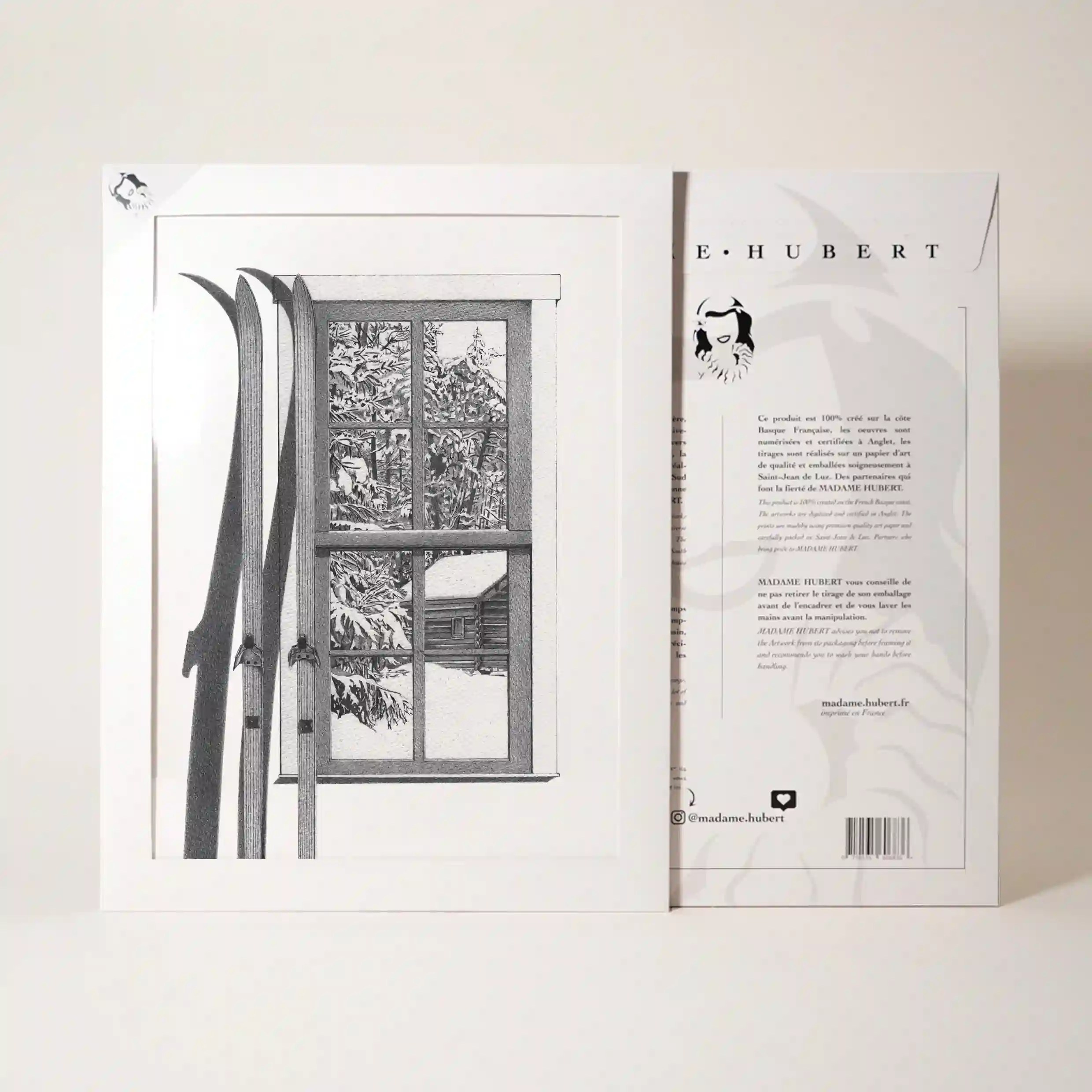 Offrez-vous une véritable évasion vers les sommets enneigés avec cette affiche montagne empreinte de sérénité et de nostalgie. Ce dessin en noir et blanc capture une scène hivernale à travers une fenêtre en bois, révélant un paysage paisible où la neige recouvre les sapins et un charmant chalet niché au cœur de la nature. Une affiche originale qui évoque le plaisir des moments passés en montagne, entre aventure et cocooning.