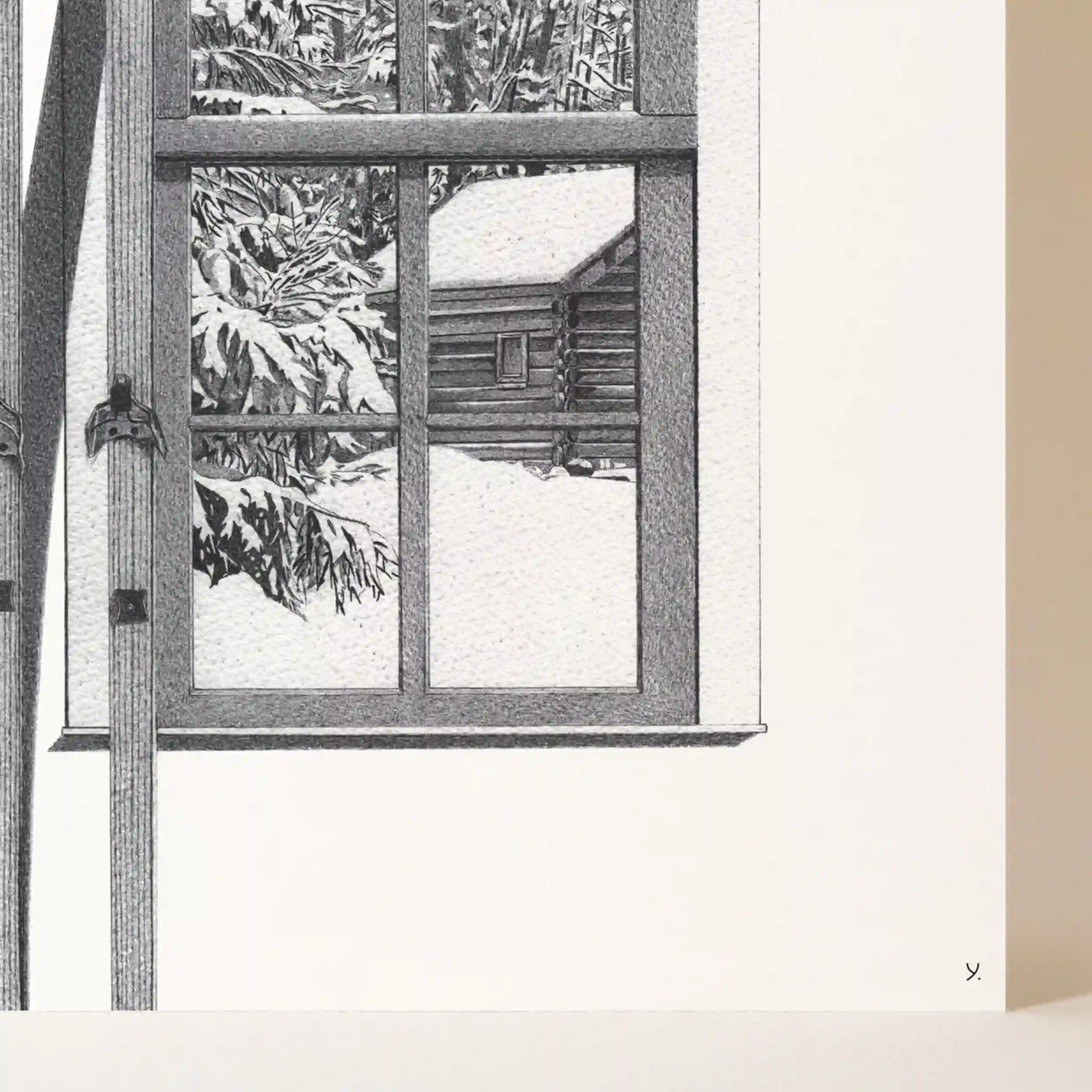 Dans cette affiche montagne, le regard est attiré par la fenêtre qui s’ouvre sur un paysage enneigé. Les détails minutieux des branches couvertes de neige et du chalet en rondins donnent une impression de profondeur et de réalisme saisissant. Cette composition donne l’impression d’être confortablement installé à l’intérieur d’un refuge, regardant la nature se dévoiler dans toute sa splendeur hivernale.