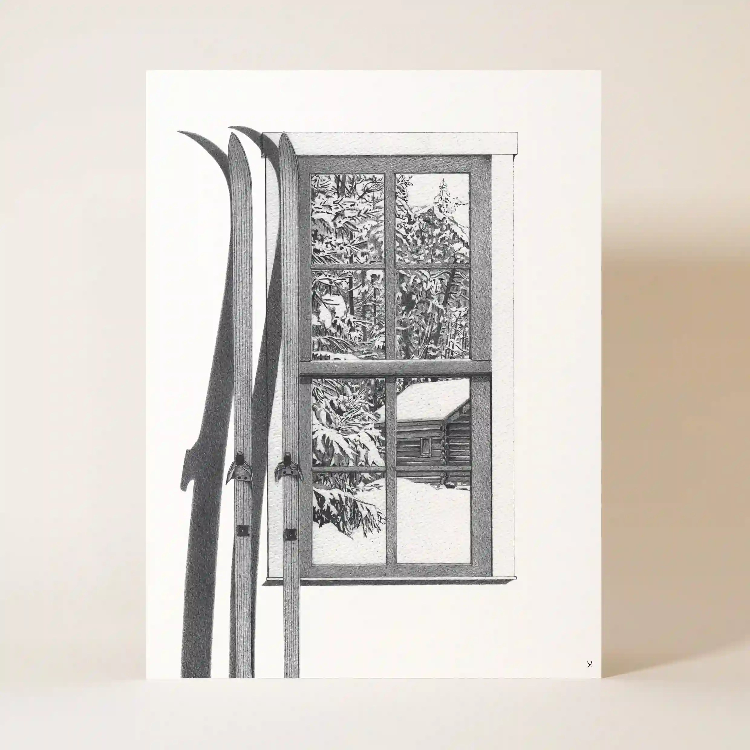 Au premier plan, une paire de skis en bois vintage est adossée au mur, suggérant une pause bien méritée après une journée sur les pistes ou en randonnée nordique. Cet élément ajoute une dimension nostalgique et authentique à l’illustration, rappelant les traditions du ski d’antan et l’amour des sports de glisse en pleine nature.